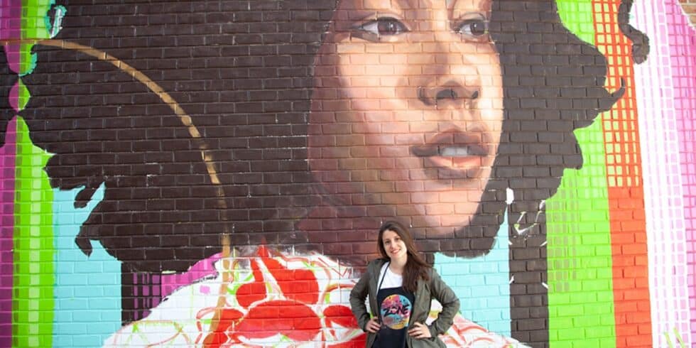 This mural is a donation from the Inter-American Development Bank to commemorate their 60th Anniversary. The image is of an empowered Latin creole/mestizo woman looking towards the future. The woman is duplicated, addressing the idea that she looks from the past and at the same time, constructs her future. Behind her, there is a rising sun created in golden paint which reflects brightly on the wall’s surface. The women’s fabric patterns create an optical illusion and a geometric contemporary feeling. The mural expresses the vibrant spirit of Latin American aesthetics, incorporated with colorful Latin American textile designs.